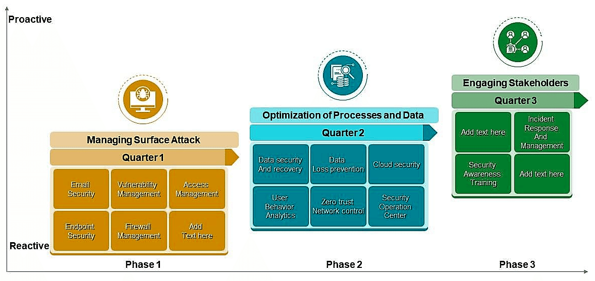 Yüzey siber saldırı yönetimini, süreç ve veri optimizasyonunu ve kurumsal büyüme için paydaş katılımını gösteren siber güvenlik stratejisi yol haritasını tasvir ediyor.